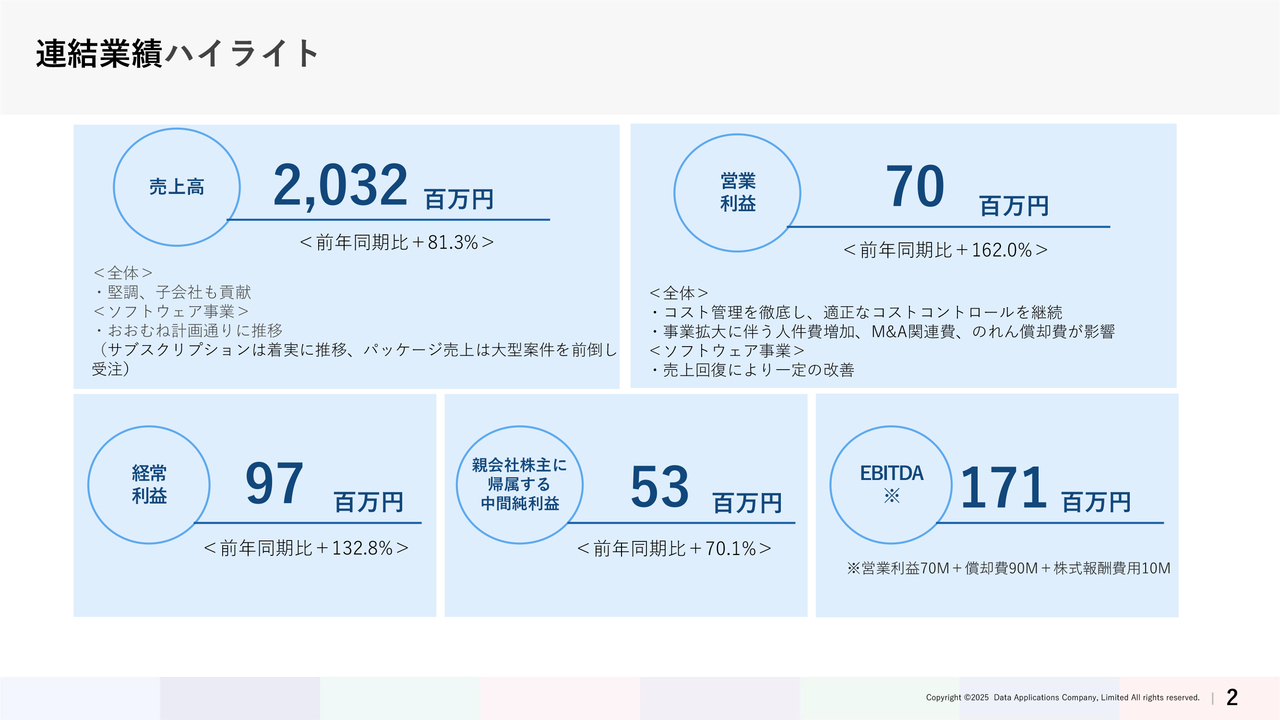 ただし、EBITDAベースでは5億円を見込んでおり、成長に向けた投資を行いつつも一定の収益性を維持できると考えています。利益面での短期的な圧迫はあるものの、グループ全体での基盤強化と将来の持続的成長に向けた準備期間と位置付け、必要な戦略的投資を引き続き実行していきます。