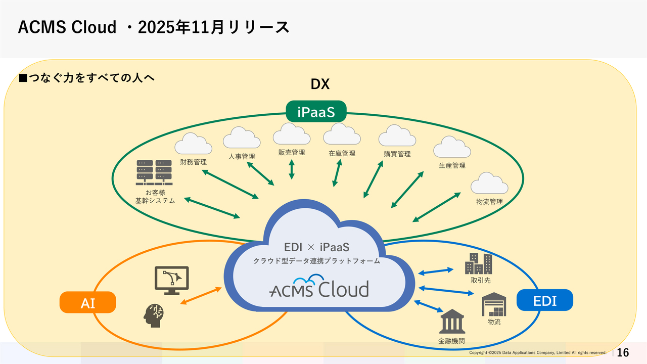 続いて、「ACMS Cloud」の概要と特徴をご紹介します。クラウド型データ連携プラットフォーム「ACMS Cloud」は、「つなぐ力をすべての人へ」をキーメッセージとし、2025年11月末にリリース予定です。