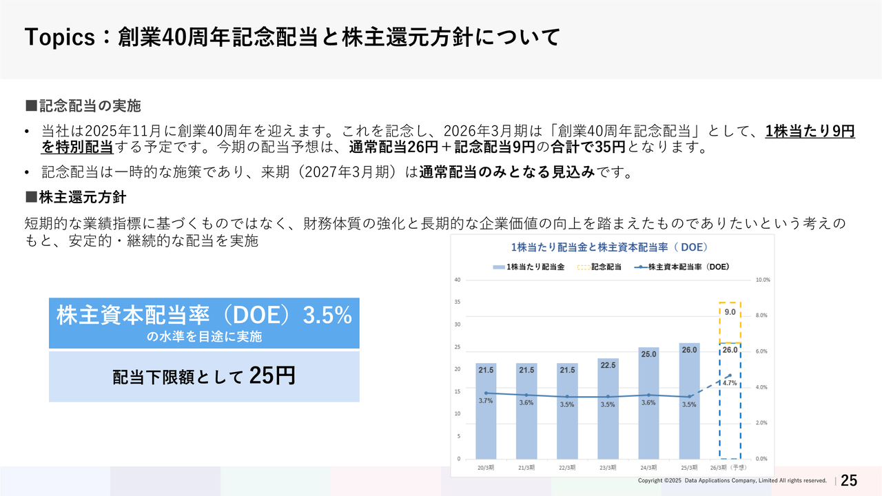 これを記念して、2026年3月期は「創業40周年記念配当」として1株当たり9円を特別配当する予定です。今期の配当予想は、通常配当26円に記念配当9円を加えた合計35円を予定しています。記念配当は一時的な施策であり、来期(2027年3月期)は通常配当のみとなる見込みです。