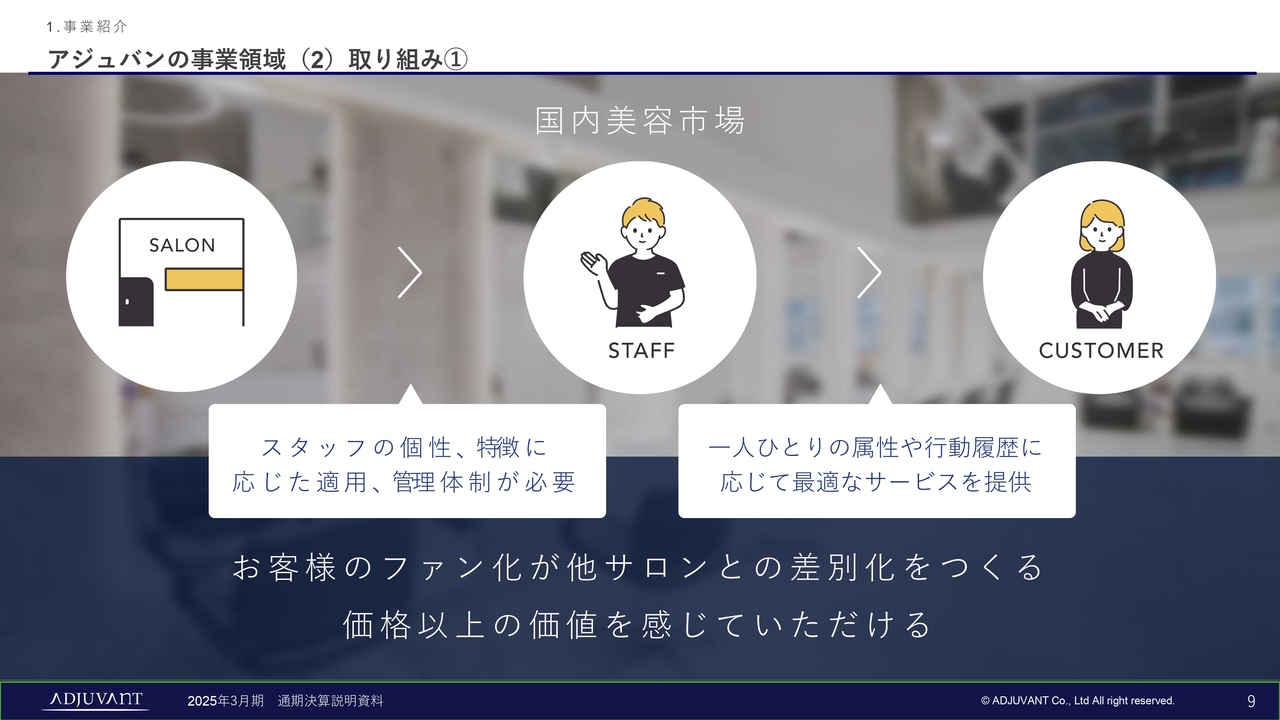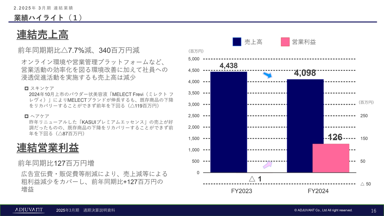 当期の成果ですが、取引先の美容サロン向けの教育動画システム「Mite Mite」の環境を整備しつつ、AI肌診断の「Mite Photo」の提供を開始し、ECサービス「ADJUVANT LINK」を導入しました。