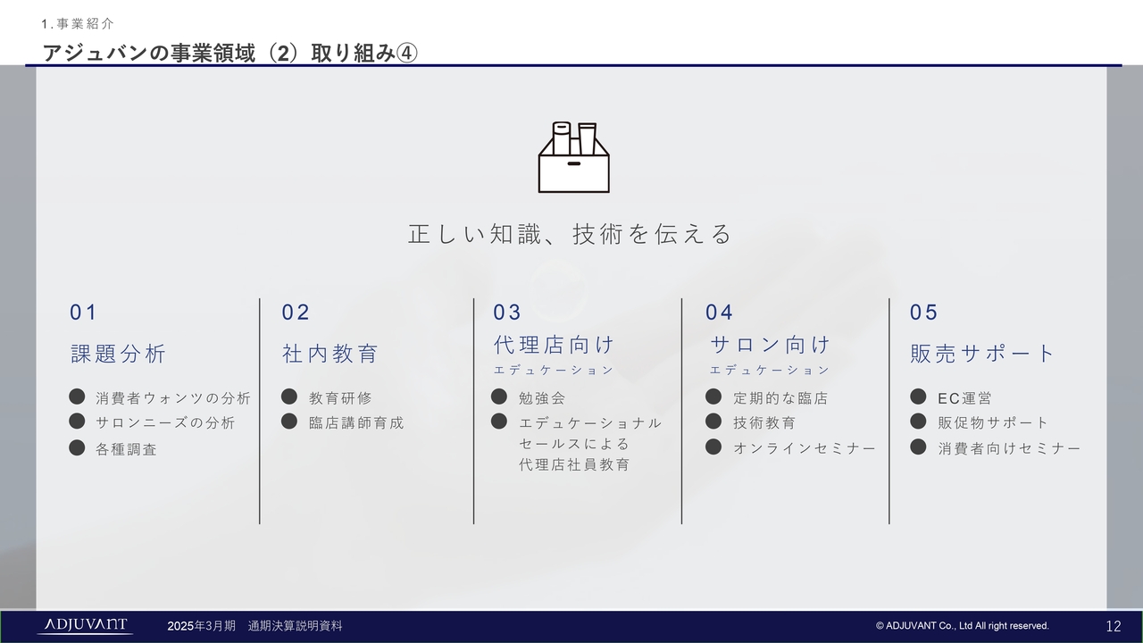 すでに発表していますが、3月21日付で株式会社シアー・プロフェッショナルを株式会社アジュバンコスメジャパンに統合しました。今期からはカラー剤事業において、アジュバンコスメジャパン商品とのシナジー効果を発揮する戦略を展開していきます。