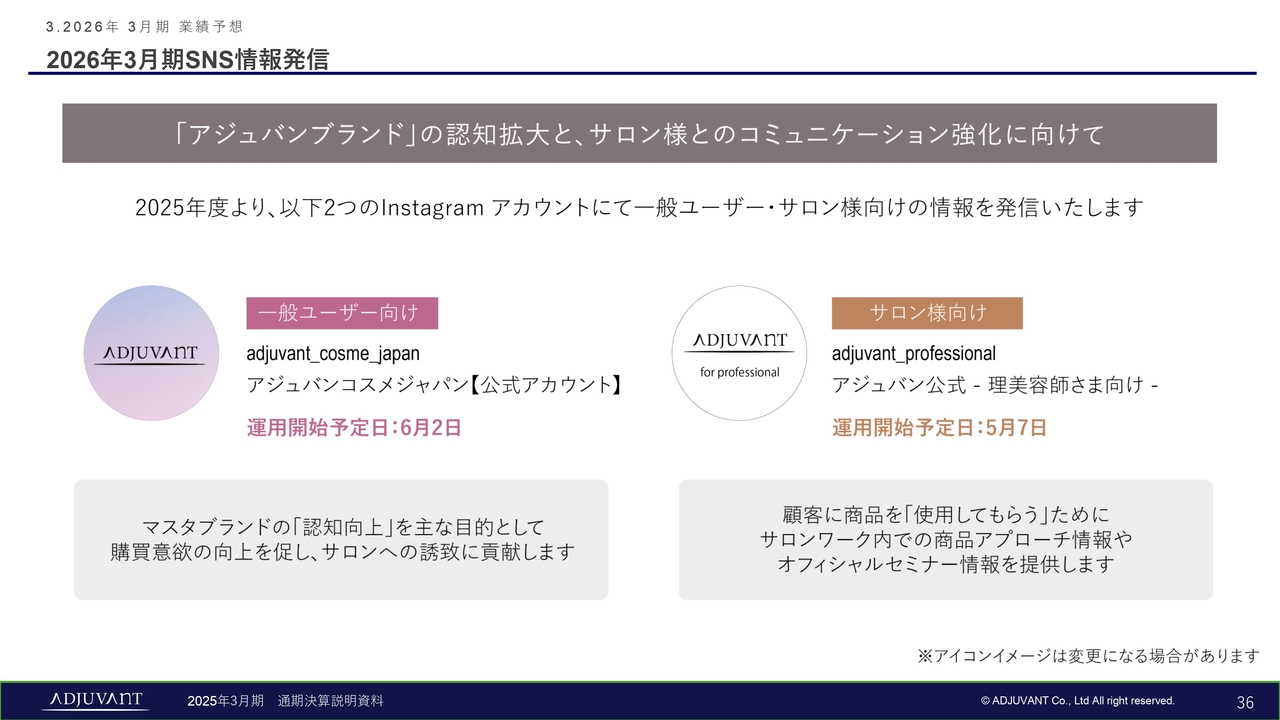 一般ユーザー向けには、「ADJUVANT」というマスターブランドの認知度向上を主な目的として発信を行います。そして、サロン向けには、サロンワーク内で商品アプローチ情報やオフィシャルセミナー情報を提供していきます。