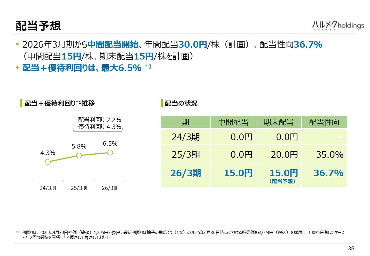 配当についてです。今期は30円とし、中間配当と期末配当でそれぞれ15円を予定しています。配当性向は35パーセントを目安としており、この計画どおりの利益の場合、2026年3月期の配当性向は36.7パーセントとなります。株主優待も加味すると、最大で6.5パーセント程度の利回りになると考えています。