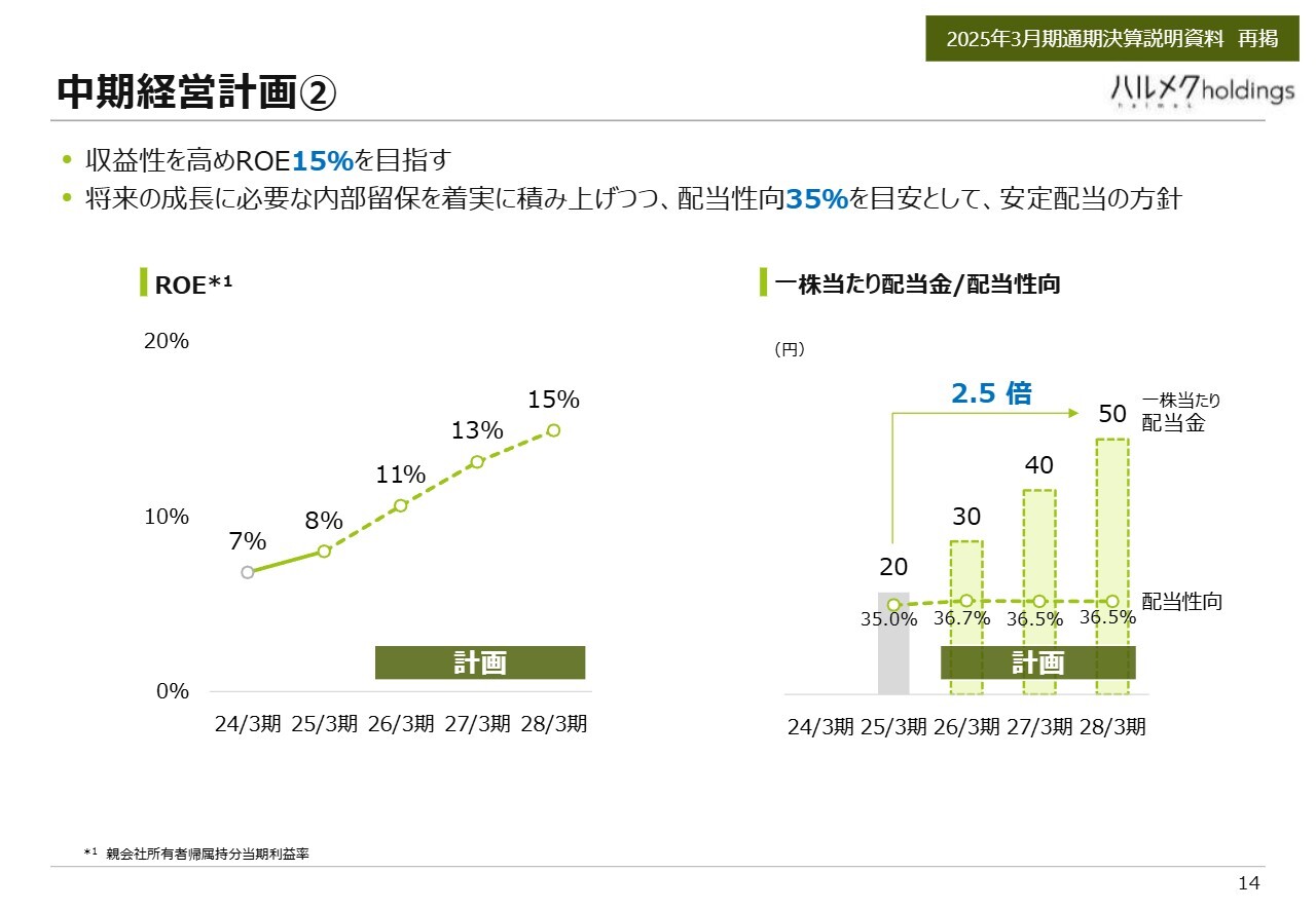 ROEについてです。前期はまだ1桁の8パーセントでしたが、今後は2桁を目指し、2028年3月期には15パーセントを目標としています。それに伴い、内部留保を行いつつ、配当性向を35パーセントで一定に保つことを目安としています。利益の増加により配当額も増やせるようにする方針です。