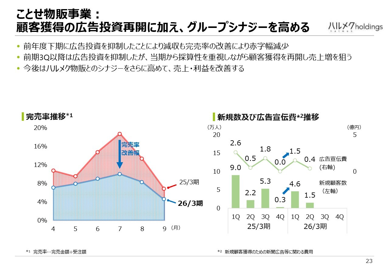 また、既存顧客の減少に加え、カタログの配布を絞った結果、売上は減少しましたが、利益面の赤字幅は改善しました。ことせ物販は下期、特に第3四半期が最も利益が大きくなる時期です。現在はまだ赤字ですが、黒字化できるかどうかは、この第3四半期の結果次第となっています。