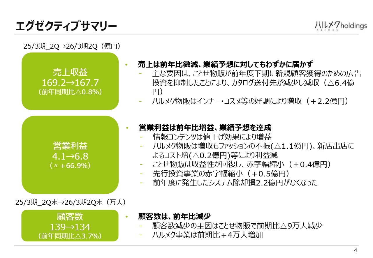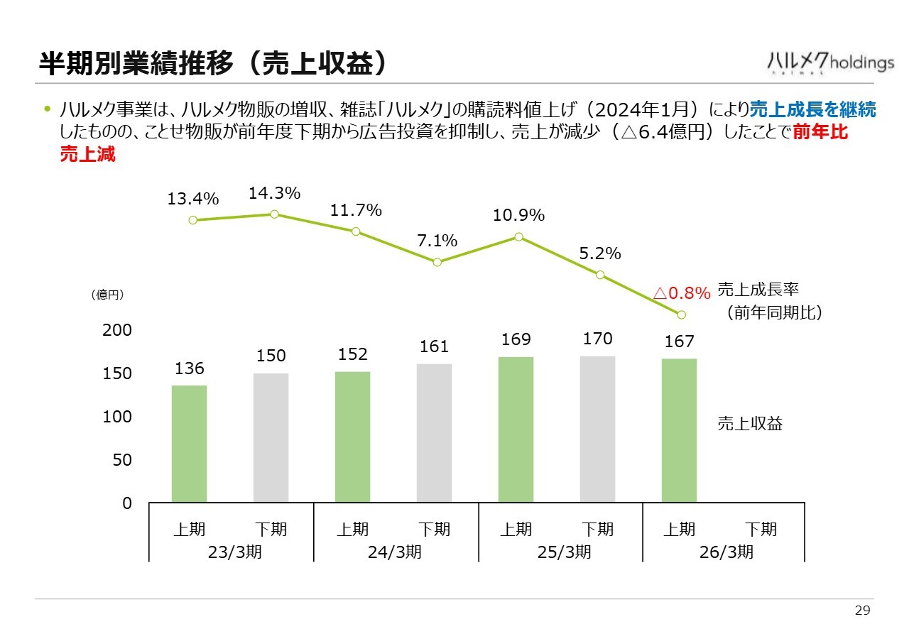 スライドには、業績の推移を半期別に時系列で示しています。ご覧のとおり、売上成長率は前年同期比で0.8パーセント減少しました。最大の要因は、ことせ物販が6億4,000万円減収したことです。ハルメクの情報コンテンツと物販の売上は増加しましたが、ことせ物販の減収を補うまでには至りませんでした。