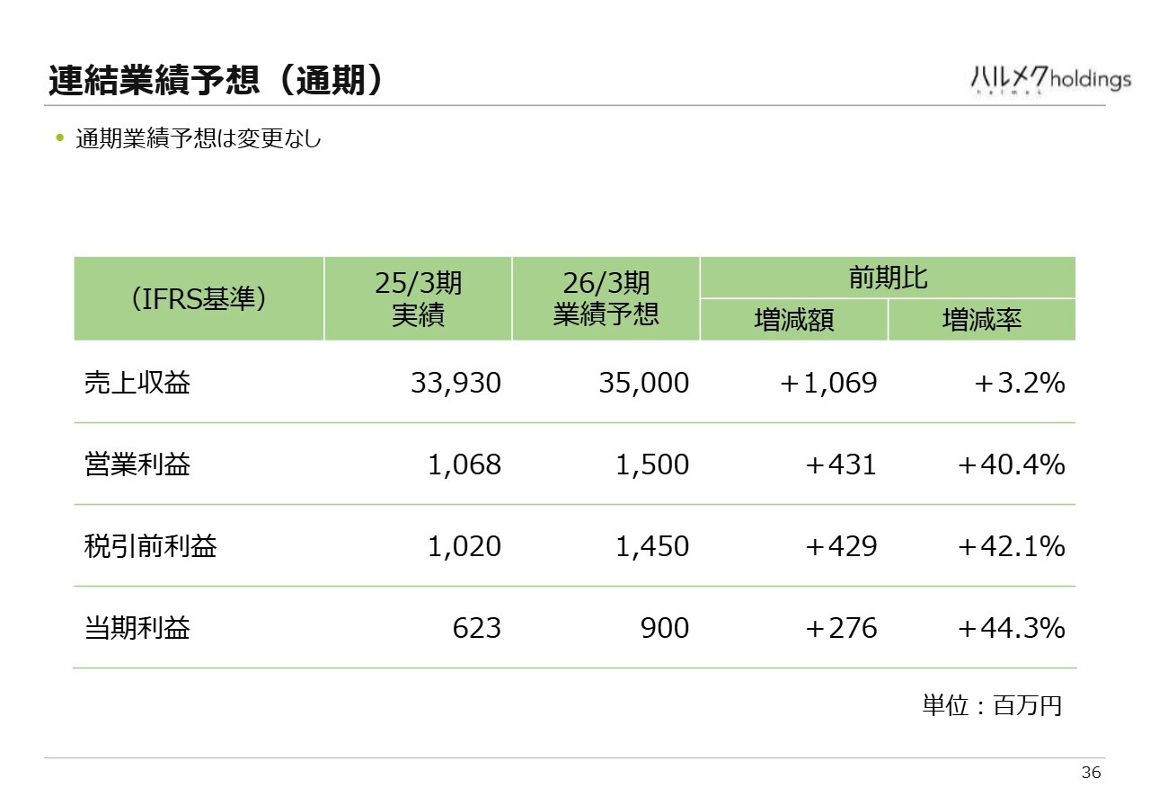 基本的に、連結の業績予想に変更はありません。売上収益は前年実績339億円に対し、2026年3月期の業績予想は350億円を見込んでいます。営業利益も前年実績10億円強に対し、2026年3月期は15億円という業績予想に変更はありません。