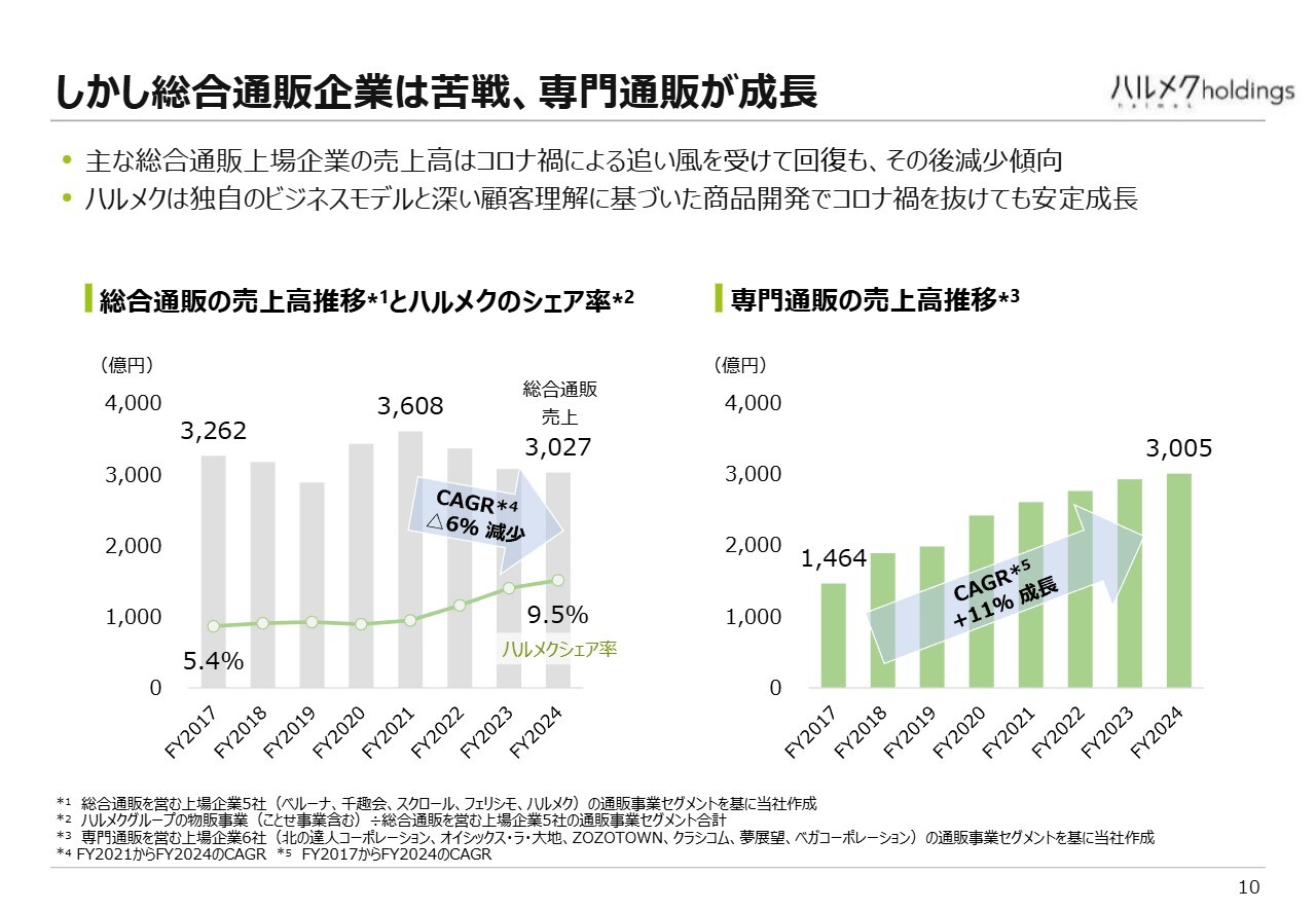 一方、「専門通販」と呼んでいる特定のカテゴリや分野に特化した通販は、スライド右側の表のとおり、順調な成長を続けています。CAGRで11パーセントの伸びを達成しており、幅広い商品を販売する形式よりも、明確な世界観やコンセプトを持った通販が成功している状況です。