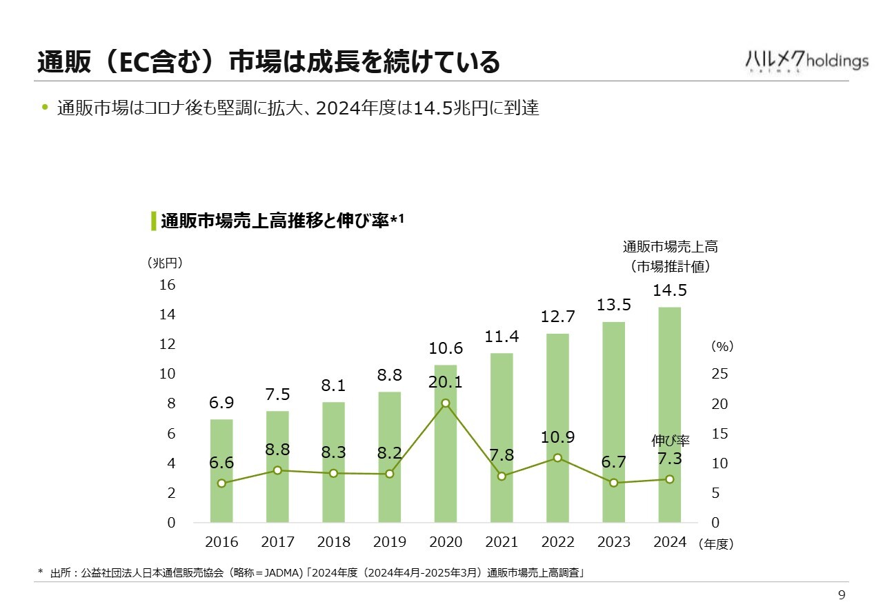 通販市場についてです。スライドのグラフは、通販市場の売上高とその成長率を示しています。直近の推定値は約14兆5,000億円と、非常に大きなマーケットです。成長率に大きな変動はなく、新型コロナウイルスの影響で一時的に大きく上昇しましたが、現在でも1桁台後半の高い伸び率を維持しています。このように、当社が取り組むビジネス環境は良好であると考えています。
