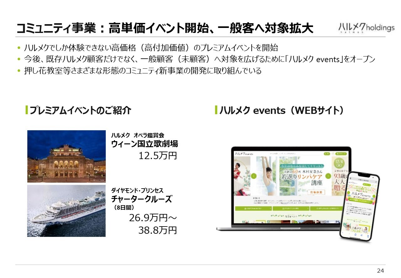コミュニティ事業では、高単価のプレミアムイベントを開始しました。今後はこのプレミアムイベントを増やし、一般のお客さまにも対象を拡大する取り組みを進めています。