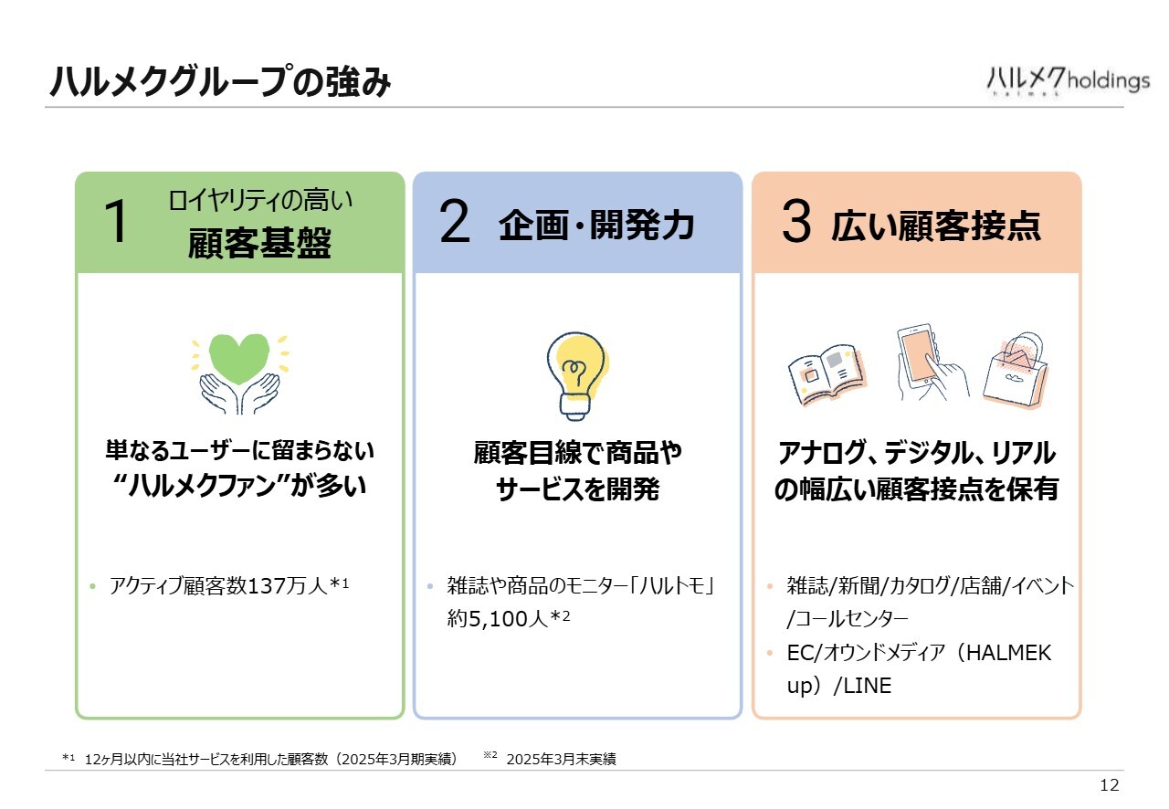 1つ目の強みは、顧客基盤です。単なるユーザーではなく「ハルメク」の熱心なファンで高い熱量を持つ方々が137万人いて、当社を応援してくださっています。これは非常に大きな強みです。
