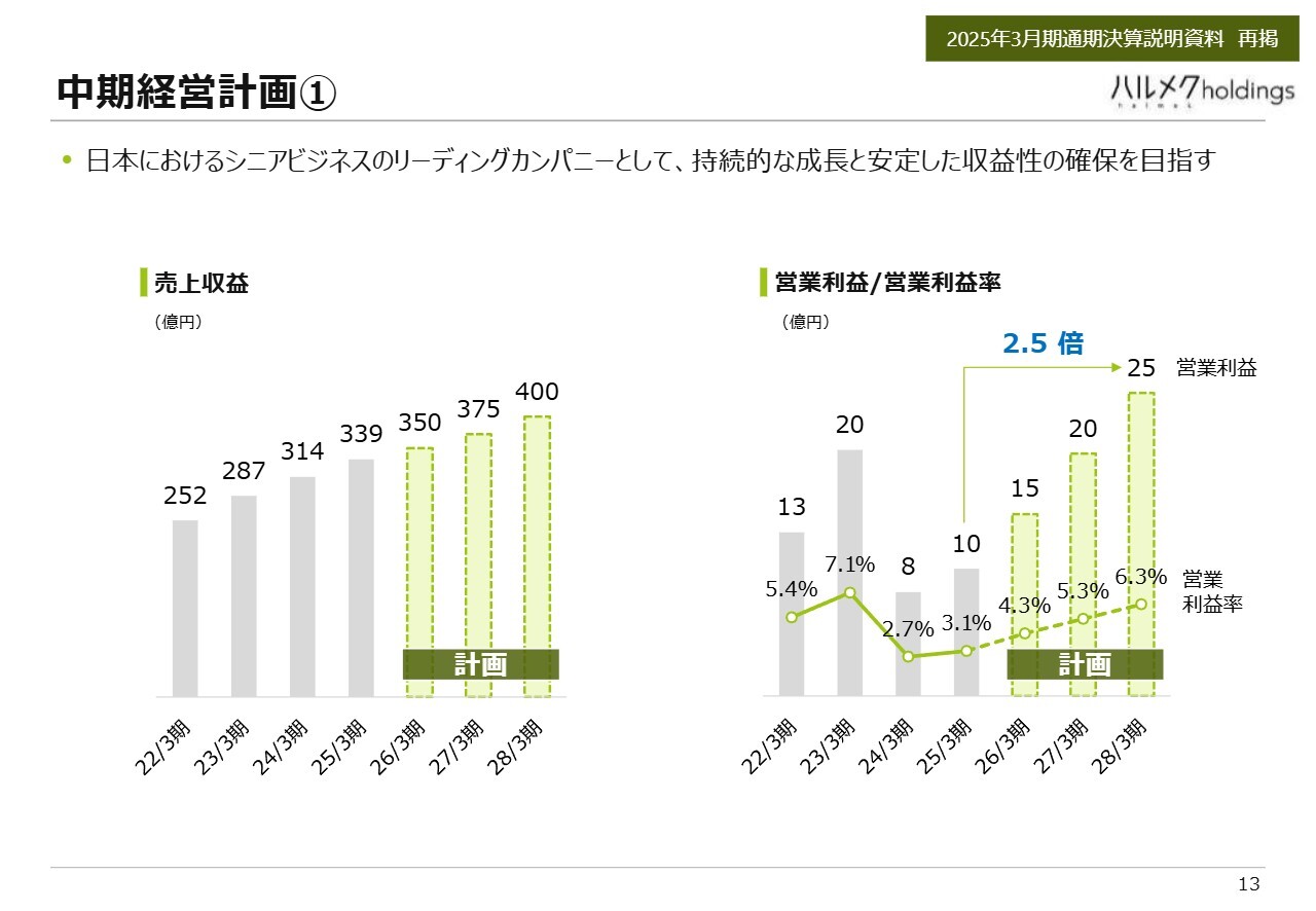 今後の目標についてご説明します。中期経営計画における売上収益は、前期が339億円でしたが、今期は350億円を目標としています。その後、25億円ずつ増加させ、375億円、400億円を目指します。