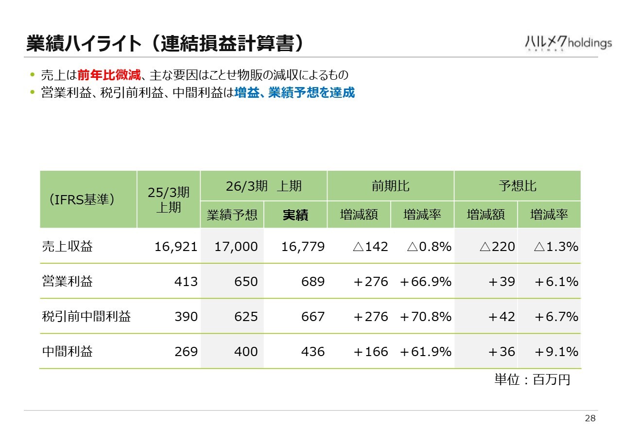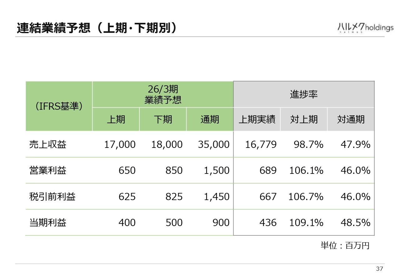 スライドの表は、連結業績予想を上期と下期に分けたものです。上期の売上収益は業績予想の170億円に若干届きませんでしたが、営業利益は業績予想を達成しました。下期は、売上収益180億円、営業利益8億5,000万円を見込んでいます。