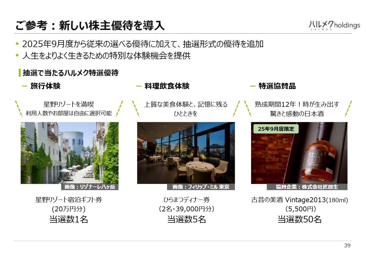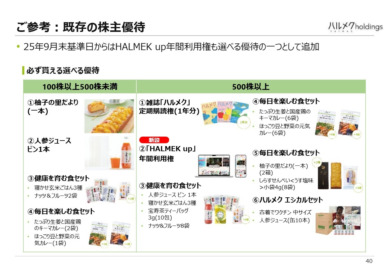 持株数に応じて全員が得られる株主優待についても、さまざまな改善を加えています。特に今年の大きな変更点として、500株以上を保有されている方々に「HALMEK up」というデジタル情報サービスを1年間利用できる特典を追加しています。