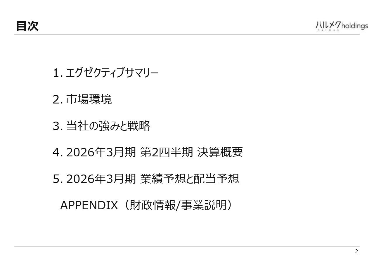 本日は5つのパートに分けてお話しします。エグゼクティブサマリー、市場環境、当社の強みと戦略、2026年3月期第2四半期の決算概要、そして業績予想と配当予想の5つです。