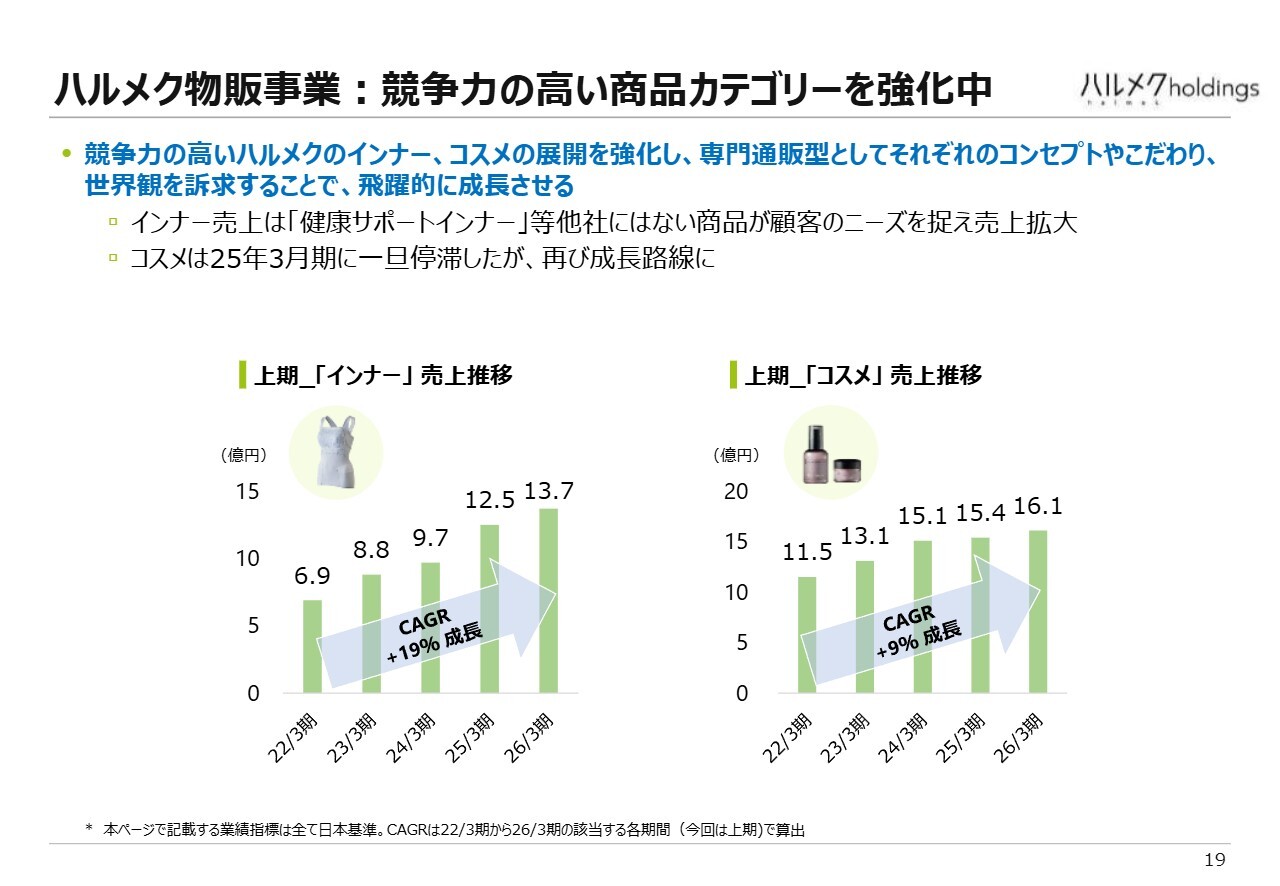 物販事業についてです。先ほど「専門通販型」をご説明しましたが、以前からインナーやコスメがカテゴリ単位で順調に推移しています。これをさらに進め、「ハルメクのインナー」「ハルメクのコスメ」という独立した事業として本格的に取り組み、成長させていく方針です。おかげさまで、本格展開前の段階からインナーおよびコスメは成長を遂げています。