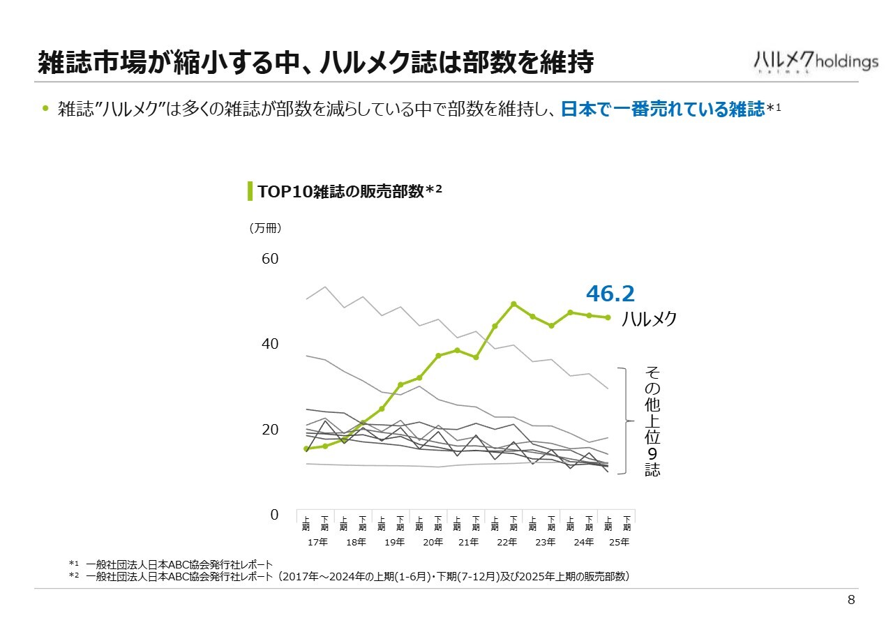 スライドのグラフはトップ10にランクインする雑誌の部数推移を表したものですが、残念ながら、いずれも減少傾向にあります。その中で、当社の雑誌は大きく増加しているわけではありませんが、部数を維持し、国内No.1のポジションを保っています。