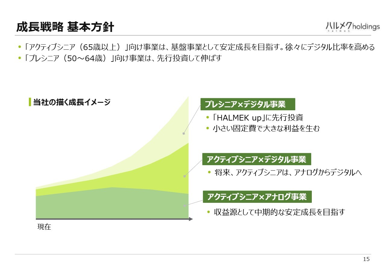 当社の現在の主力は65歳以上の方々で、「アクティブシニア」と呼んでいます。スライドの成長イメージでは下の部分に該当し、この層が当社の基盤となるお客さまです。このセグメントについては安定成長を目指しています。ただし、まだアナログ志向の方が多いため、徐々にデジタルに慣れ親しんだ方々が増えることを見据え、デジタル比率を徐々に上げていく方針です。