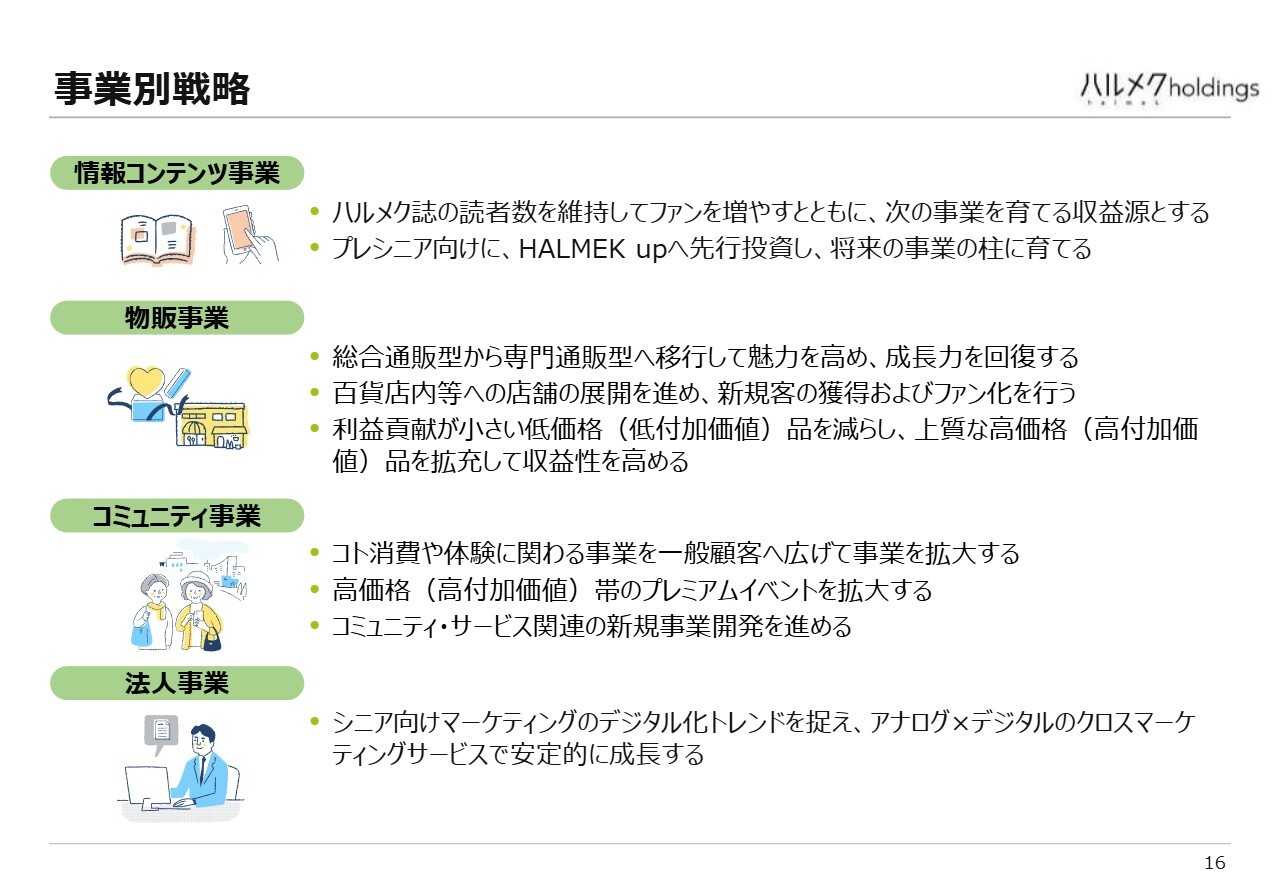 雑誌などの情報コンテンツに関しては、先ほど『ハルメク』誌の読者数をご覧いただきましたが、基本的には現状を維持する方針です。もちろん、プラス成長を目指して努力を続けていますが、「ハルメク」のファンを増やすための重要なサービスと位置づけています。そして、ここで得られた利益を次の事業を育てる収益源として活用しようと考えています。