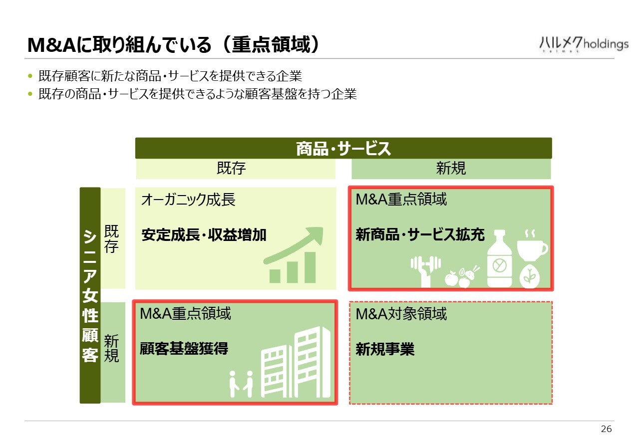 M&Aの取り組みをご説明します。スライドの図は従来と同じものです。基本的な方針は2つあります。1つは、当社の既存のお客さまに対し、当社が持っていない商品を提供できる企業をM&Aすることです。もう1つは、当社の顧客とは異なるシニア層のお客さまを持つ企業に、当社の既存商品を購入してもらうことです。これらに限りませんが、このような考え方で現在、企業の探索を進めています。