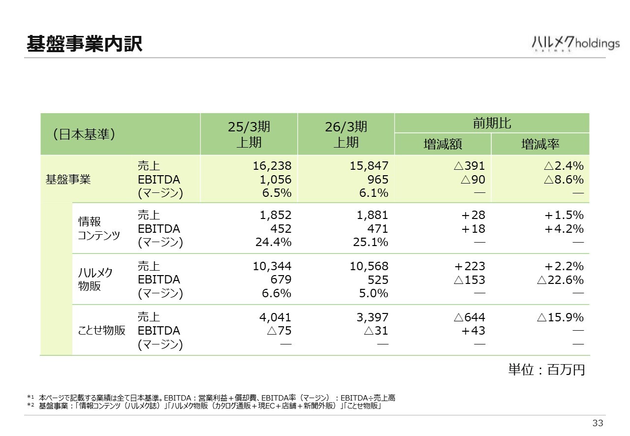 スライドの表は、基盤事業の減収減益の内訳を分解したものです。雑誌を中心とした情報コンテンツは、売上高が前年同期比2,800万円増、利益も前年同期比1,800万円増となり、増収増益でした。