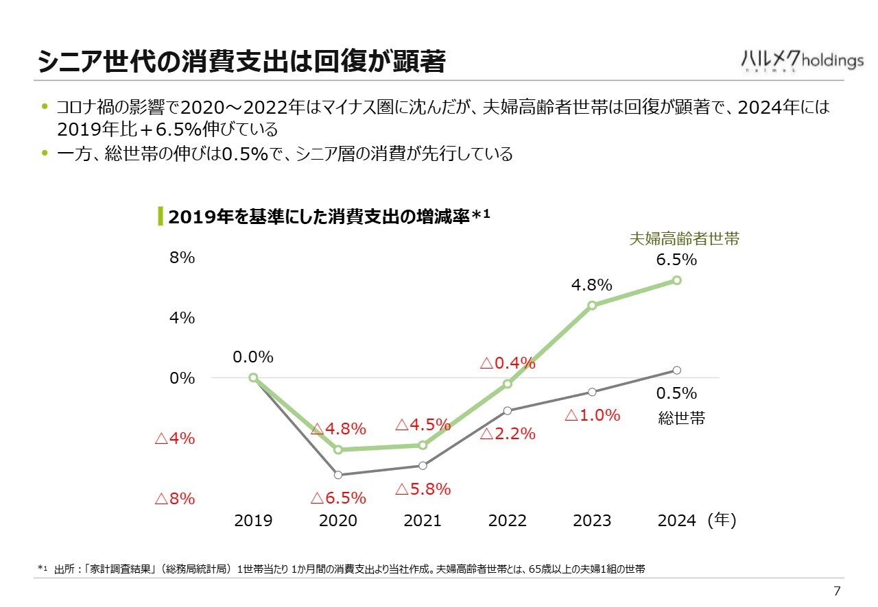 比較すると、高齢者世帯の増加率は6.5パーセントと大きく伸びている一方、総世帯では0.5パーセントにとどまっています。つまり、より高齢の世帯ほど消費支出が伸びている状況です。これも当社にとってはプラスの市場環境だと考えています。