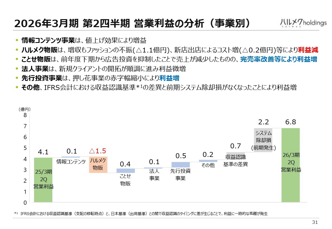 2026年3月期第2四半期の営業利益が4億1,000万円から6億8,000万円に増加した内訳を、ブリックチャートを用いて因数分解したものです。図が少々複雑で恐縮ですが、雑誌が中心の情報コンテンツ事業では微増となりました。一方、「増収だったが減益だった」とお伝えしたハルメク物販には、大きな課題が残っています。