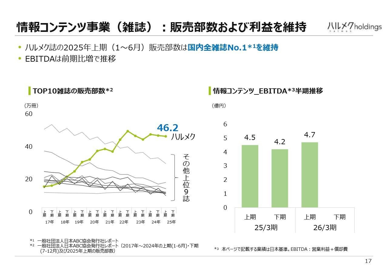 まず、情報コンテンツ事業です。先ほど説明したとおり、雑誌の販売部数はトップを維持しています。利益については、スライドの右側にEBITDAで示しているとおり、値上げの効果により増加しています。