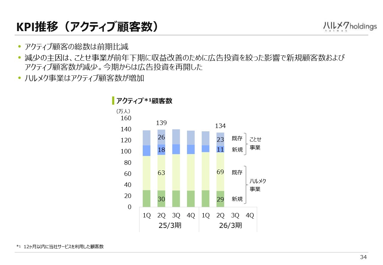 もう1つの重要な指標である顧客数は、前年の139万人から134万人に減少しました。減少の主な要因は、ことせ物販で広告投資を絞ったことから9万人の減少した点が挙げられます。一方、ハルメク物販では顧客数が4万人ほど増加しています。