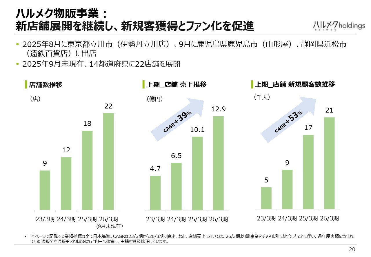 スライドに、新たに出店した店舗の場所を記載しています。これに伴い売上も伸び、さらに、当社の重要なミッションの1つである「百貨店に来店された当社のお客さまでない方々に店舗へ入店してもらい、新規顧客登録を進める」取り組みを行っています。その結果、新規のお客さまの数も増加している状況です。