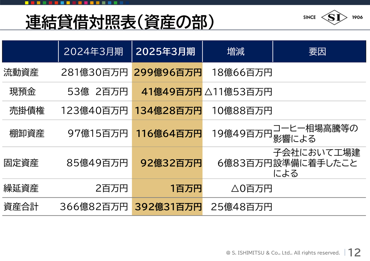 固定資産は、前期比6億8,300万円増の92億3,200万円となりました。こちらは、コーヒーの焙煎を行う関連会社アライドコーヒーロースターズにおいて、新工場建設の準備に着手したことにより増加しています。
