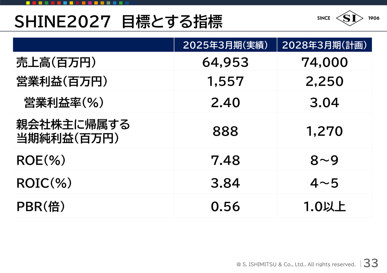ROEは8パーセントから9パーセント、ROICは4パーセントから5パーセントを目指し、なによりもPBRを1.0倍以上に持っていくことが目標です。
