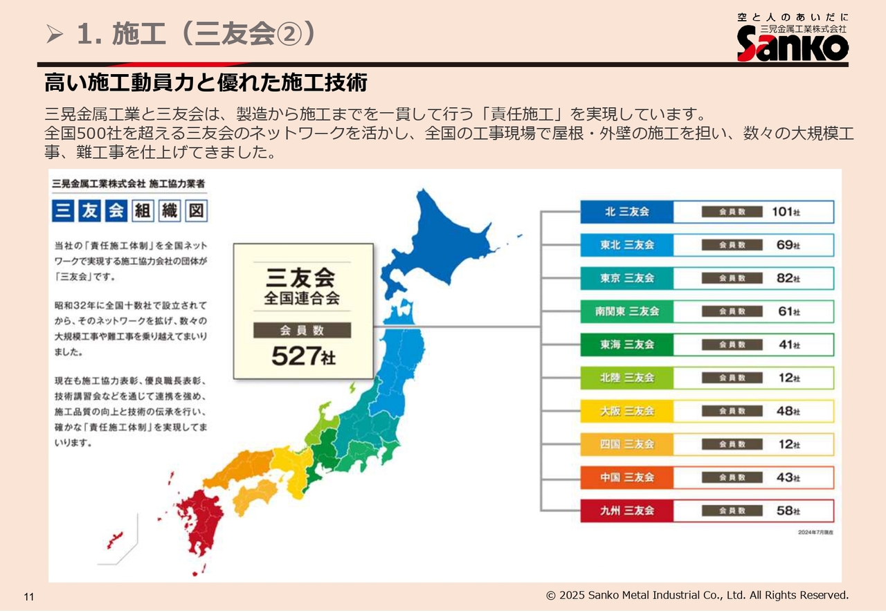 全国に50ヶ所の事業所と500社を超える施工協力会社「三友会」のネットワークを活かし、自社製品の製造から設計、施工まで一貫した「責任施工」体制を実現しています。