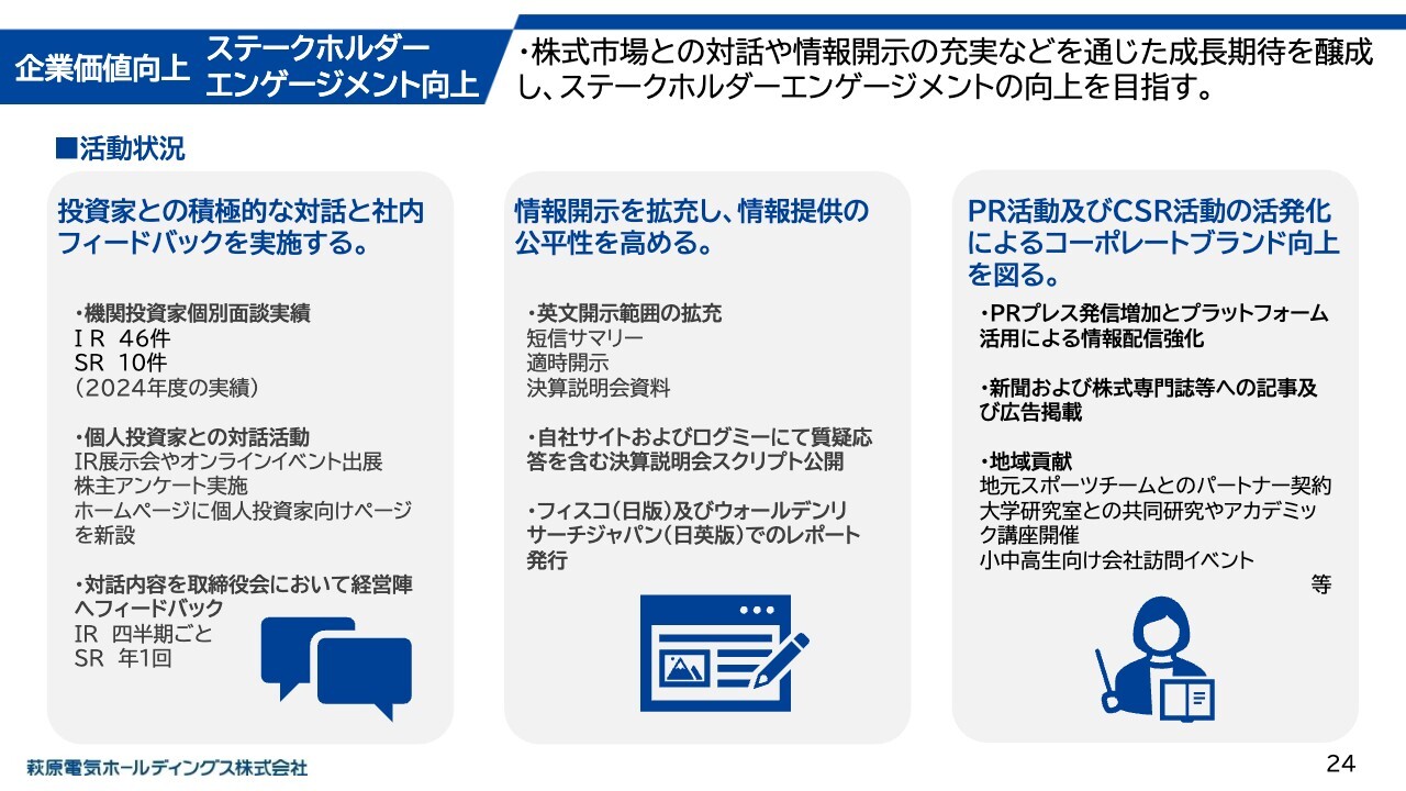 ステークホルダーエンゲージメント向上に向けた取り組みについてご説明します。2024年4月から2025年3月までの1年間で、機関投資家のみなさまとの個別面談を56件実施し、それぞれの対話内容は、経営会議や取締役会へ定期的にフィードバックしています。