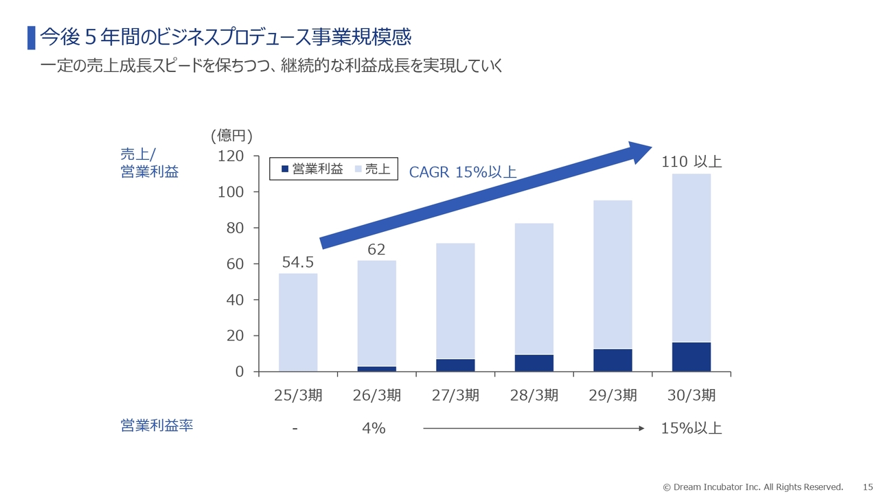 スライドに、今後5年間のビジネスプロデュースの事業規模感をグラフで示しています。