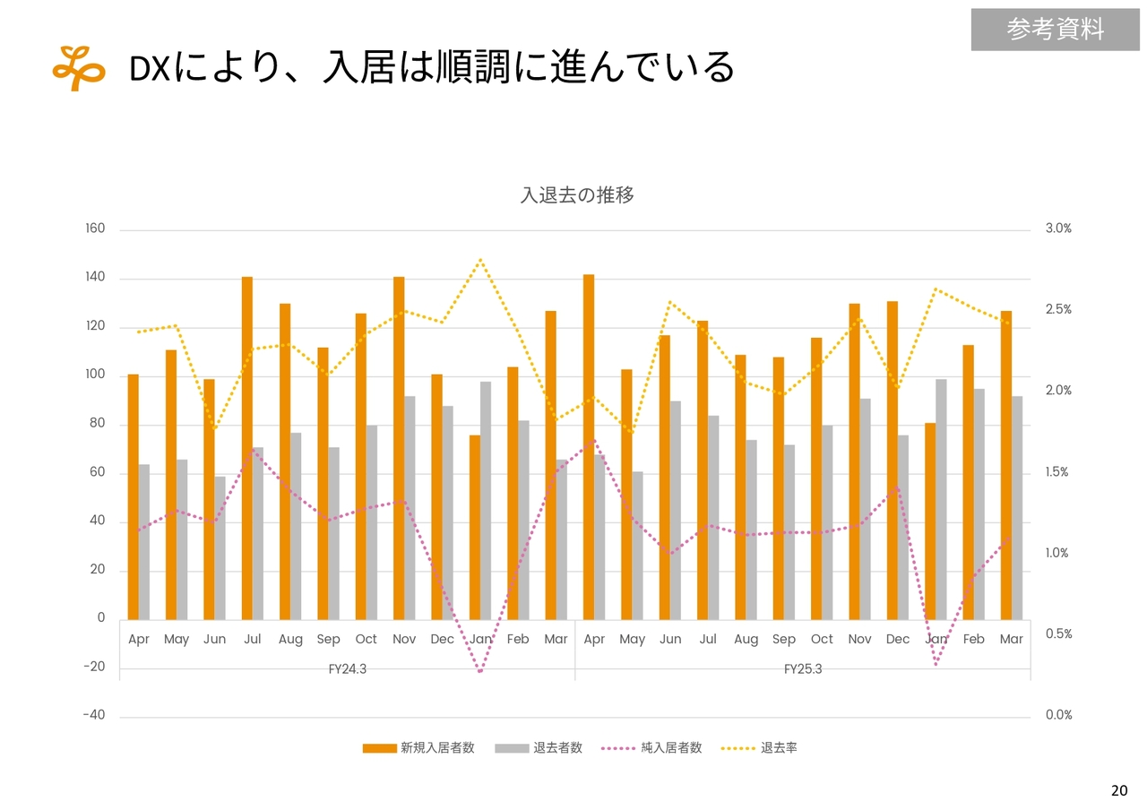 スライドのグラフは、入居と退去の推移として、退去率や純入居者数を記載しています。退去がかなり増えている一方で、入居も順調に増えている状況です。これまで以上に純入居者、稼働率が全体として上がるように進めていきたいと考えています。