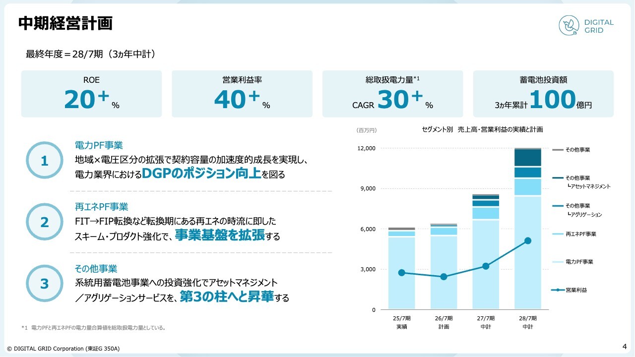 中期経営計画では、ROE、営業利益率、プラットフォーム事業における総取扱電力量、さらに第3の柱とする系統用蓄電池の事業(調整力事業)への投資額を定量的なKPIとして掲げています。