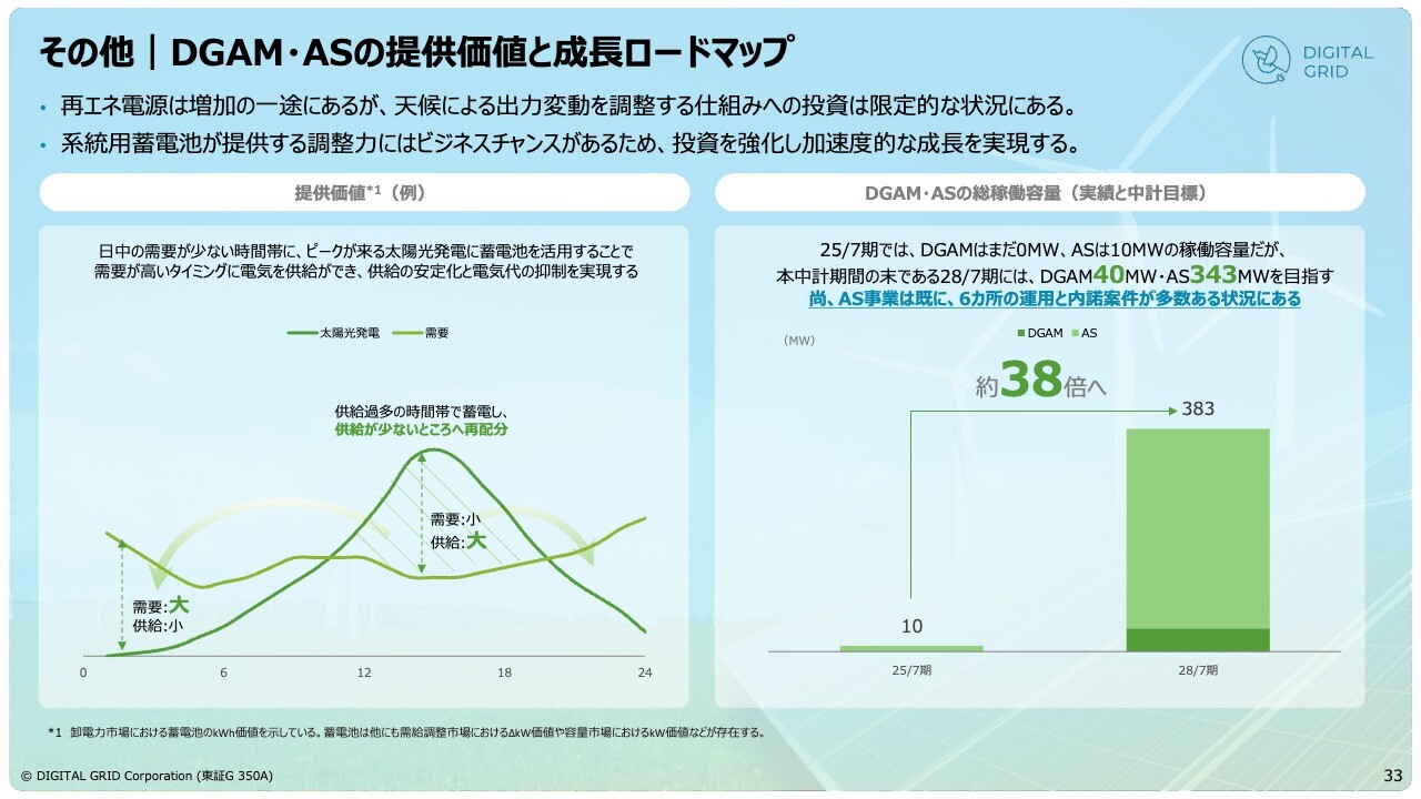実際の数字ベースで見ると、2028年7月期の総稼働容量としては、自社保有の事業とAS事業を合わせて383メガワットの蓄電池に携わることを目標としています。現時点では運転しているのは6ヶ所にとどまっていますが、今年度を含めて多くの内諾案件があり、この数字はまったく非現実的ではないと考えています。