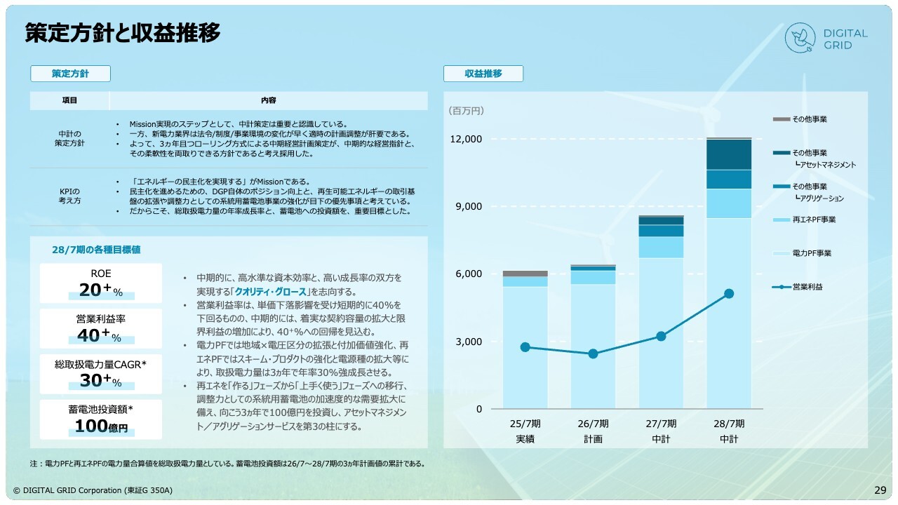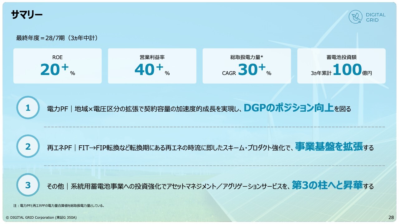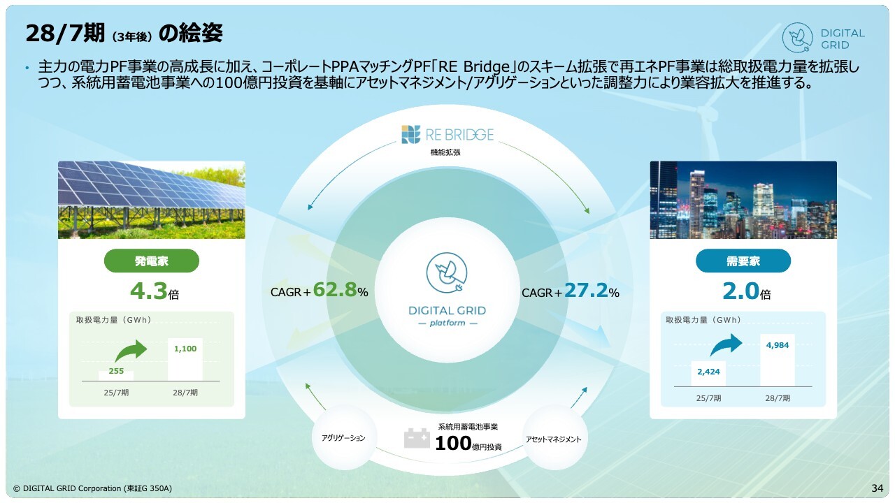 2028年7月期の目標として、発電家は4.3倍、需要家は2倍以上の利用者を想定しています。さらに、第3の柱として系統用蓄電池事業に約100億円を投資し、この事業を重要な基盤として確立していく方針です。