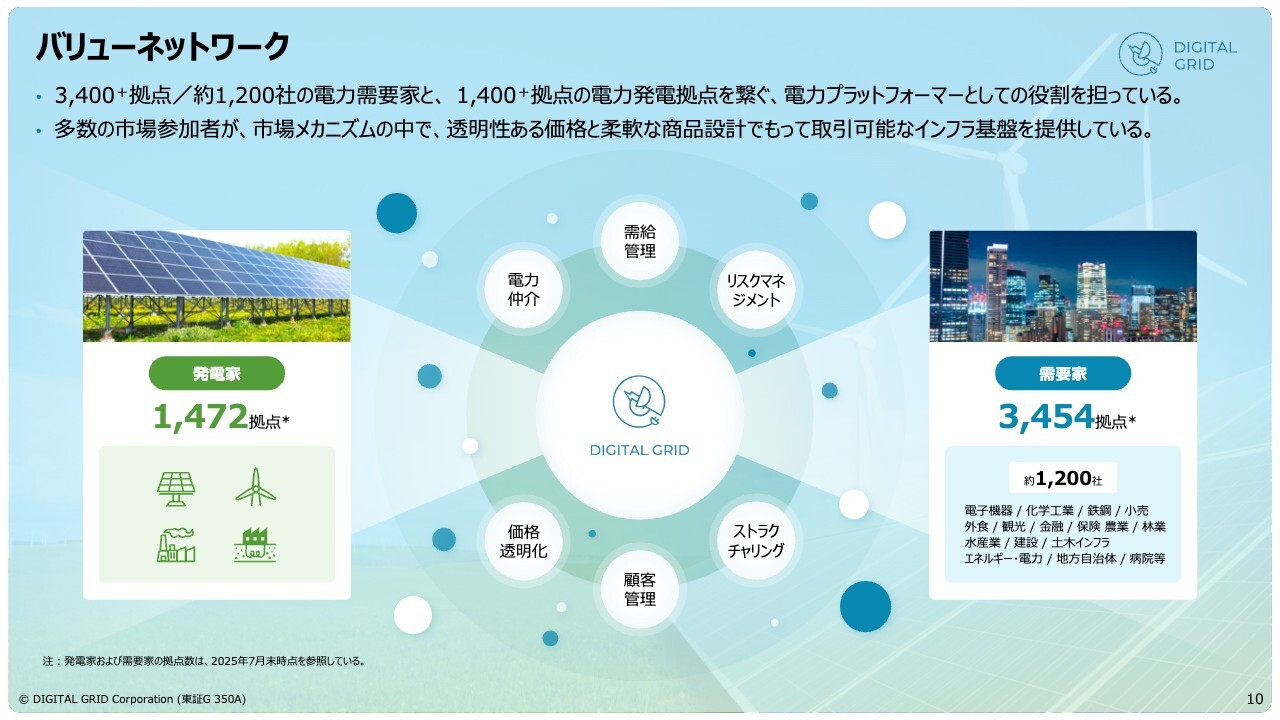 お客さまの状況についてご説明します。当社のプラットフォームは、需要家で3,400拠点以上、発電家で1,400拠点以上の方々にご利用いただいており、日々このプラットフォームで売買が行われています。