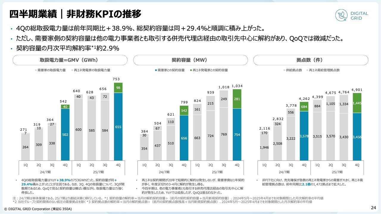 非財務KPIの推移です。取扱電力量は前年同期比プラス38.9パーセント、総契約容量は前年同期比プラス29.4パーセントと伸長しています。