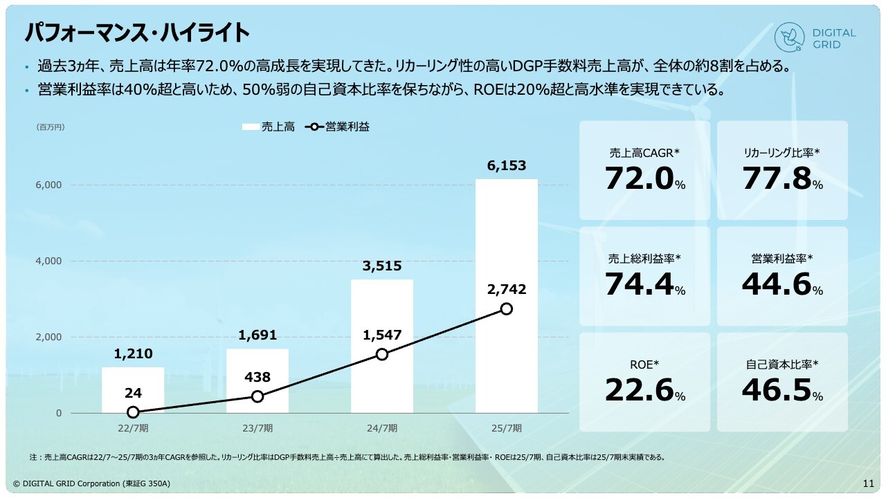 パフォーマンス・ハイライトです。2022年7月期からの推移を示しています。順調に伸び続けた要因として、みなさまも記憶に新しいと思いますが、2022年のロシア・ウクライナ情勢による緊張感の影響でコモディティ価格が高騰し、電気代も著しく上昇しました。