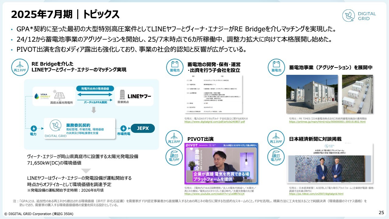 内容としては、買い手がLINEヤフー、売り手がヴィーナ・エナジーで、70メガワット以上の再生可能エネルギーを対象とした大型の太陽光取引が成立しました。当社の収益認識の観点では、太陽光の運転開始予定日が来年8月となるため、それ以降に反映されます。このような日本を代表する企業さまとの取引が進展していることをご報告します。