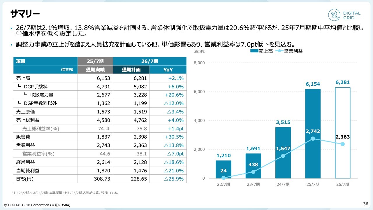 最後に、2026年7月期の通期計画についてご説明します。2026年7月期の売上高は、前期比で微増のプラス2.1パーセントとなる62億8,100万円を見込んでいます。営業利益については、単価の下落や調整力事業の立ち上げに伴い、23億6,300万円と減益を見込んでいます。