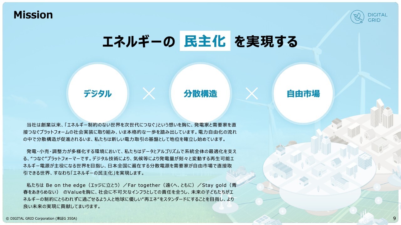 そこで、デジタル技術を融合させ、さらに電気を自由に取引できる自由市場を実現することで、エネルギー価格の抑制やボラティリティの低下を図り、安心・安全に電気を利用できる社会を未来に託すことが我々の使命であり、掲げている目標です。