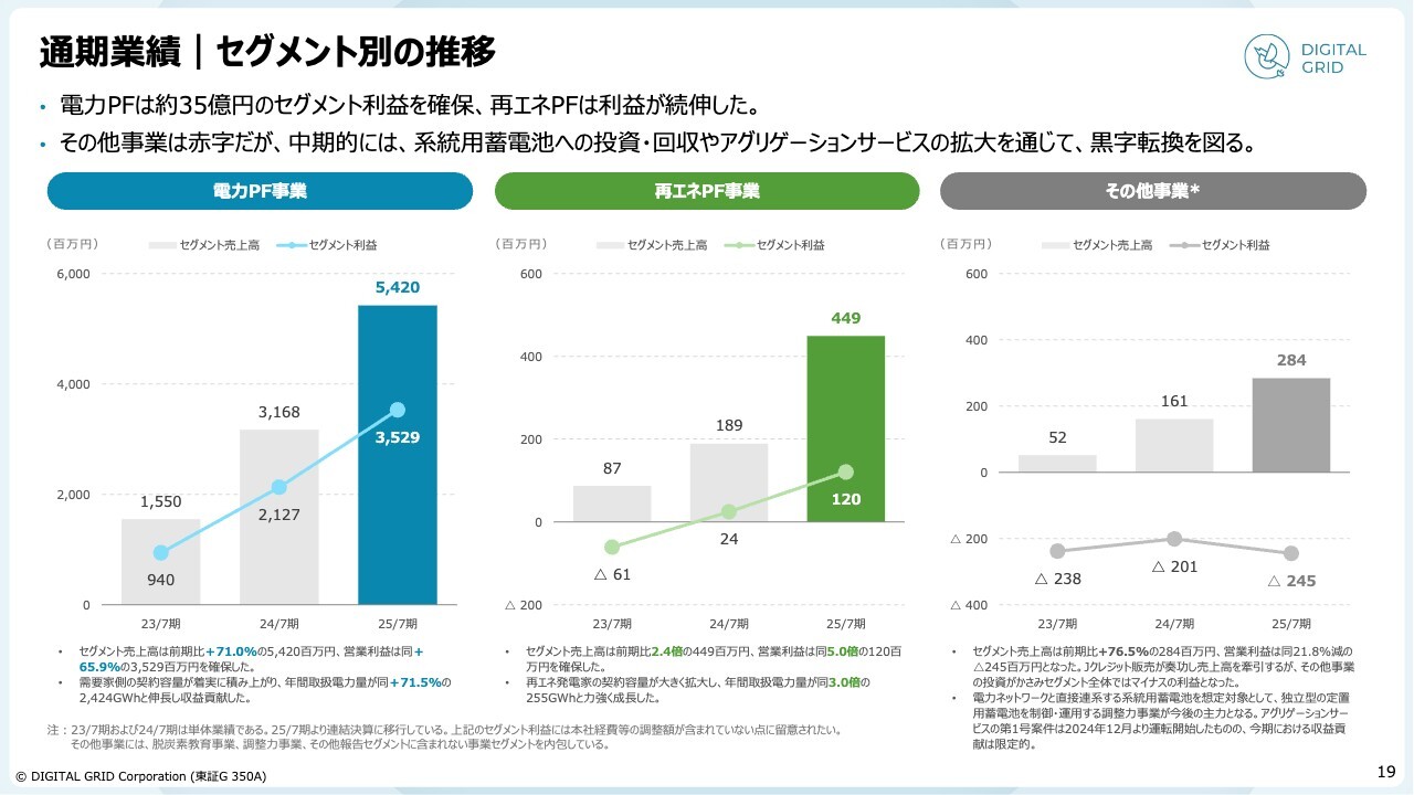 その他事業については、先行投資が多分に含まれています。先ほどお伝えした系統用蓄電池事業に係る投資も含まれており、こちらについては後ほどご説明する中期経営計画において、早期の黒字化を目指して取り組む方針です。