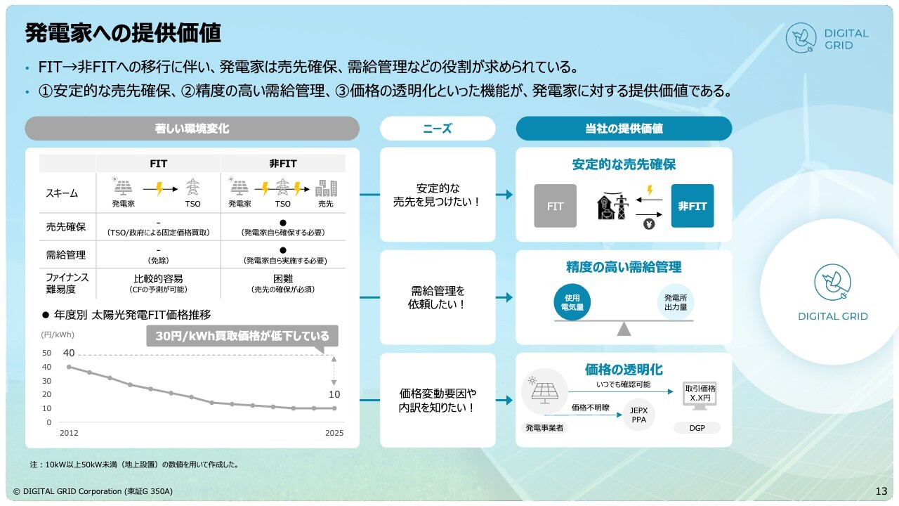 発電家への提供価値についてです。こちらも大きな構造変化がありました。東日本大震災後の2012年に始まったFIT(固定価格買取制度)により、再生可能エネルギーが爆発的に増加しました。しかし、2022年からこの制度が順次終了し、新しい制度、または制度に頼らずに再生可能エネルギーを増やす必要がある環境へと変化しています。