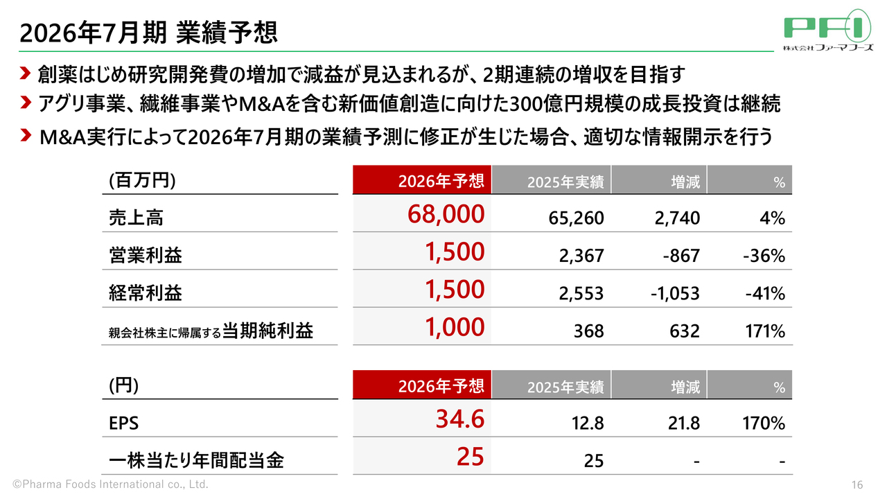 こちらのスライドは、2026年7月期の業績予測です。売上高は680億円と2期連続の増収を見込んでいますが、創薬をはじめアグリ事業や繊維事業への成長投資により減益となる見込みです。なお、M&Aを実行し業績予想に修正が生じた場合には、適切な情報開示を行います。