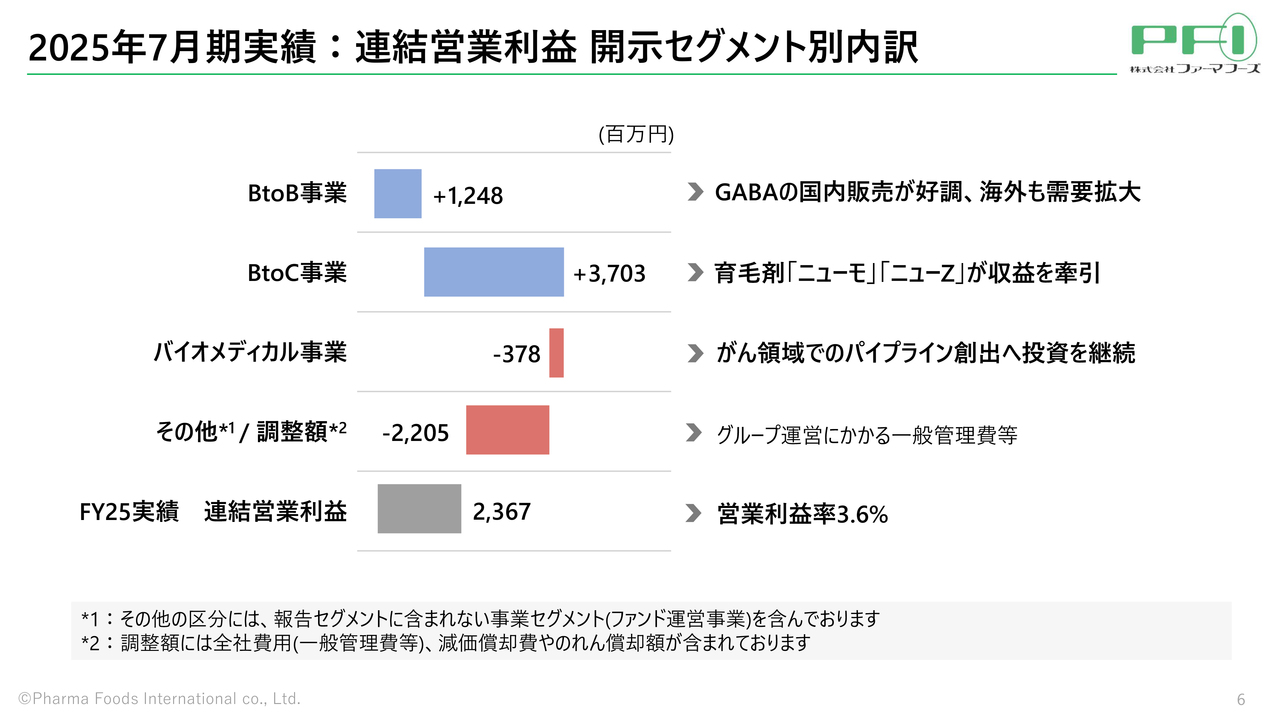 BtoC事業では、好調な新製品に対する先行投資を行いながらも、育毛剤「ニューモ」ブランドの売上が伸長し、営業利益は約37億円となりました。この利益からバイオメディカル事業の研究開発投資やグループ運営にかかる一般管理費を差し引いた結果、最終的な営業利益率は3.6パーセントとなりました。