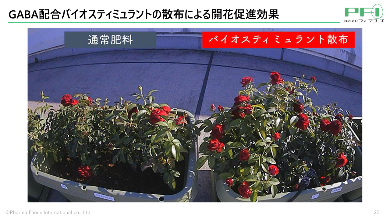 ご覧のとおり、花がより多く、早く咲くことが確認できました。実は、このバイオスティミュラントは、当社が主力としているGABAです。